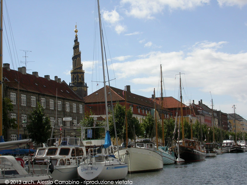 Christianshavn. Sullo sfondo Vor Frelserskirke, Chiesa del Nostro Redentore, in stile barocco danese.