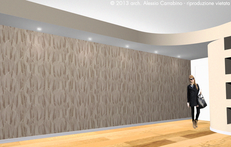 Controsoffitto – Soluzione 2. La parete è valorizzata con carta da parati.