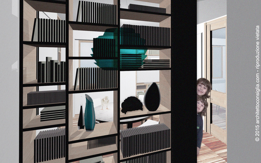 img. 2 – Particolare della libreria posizionata all’ingresso dell’appartamento.